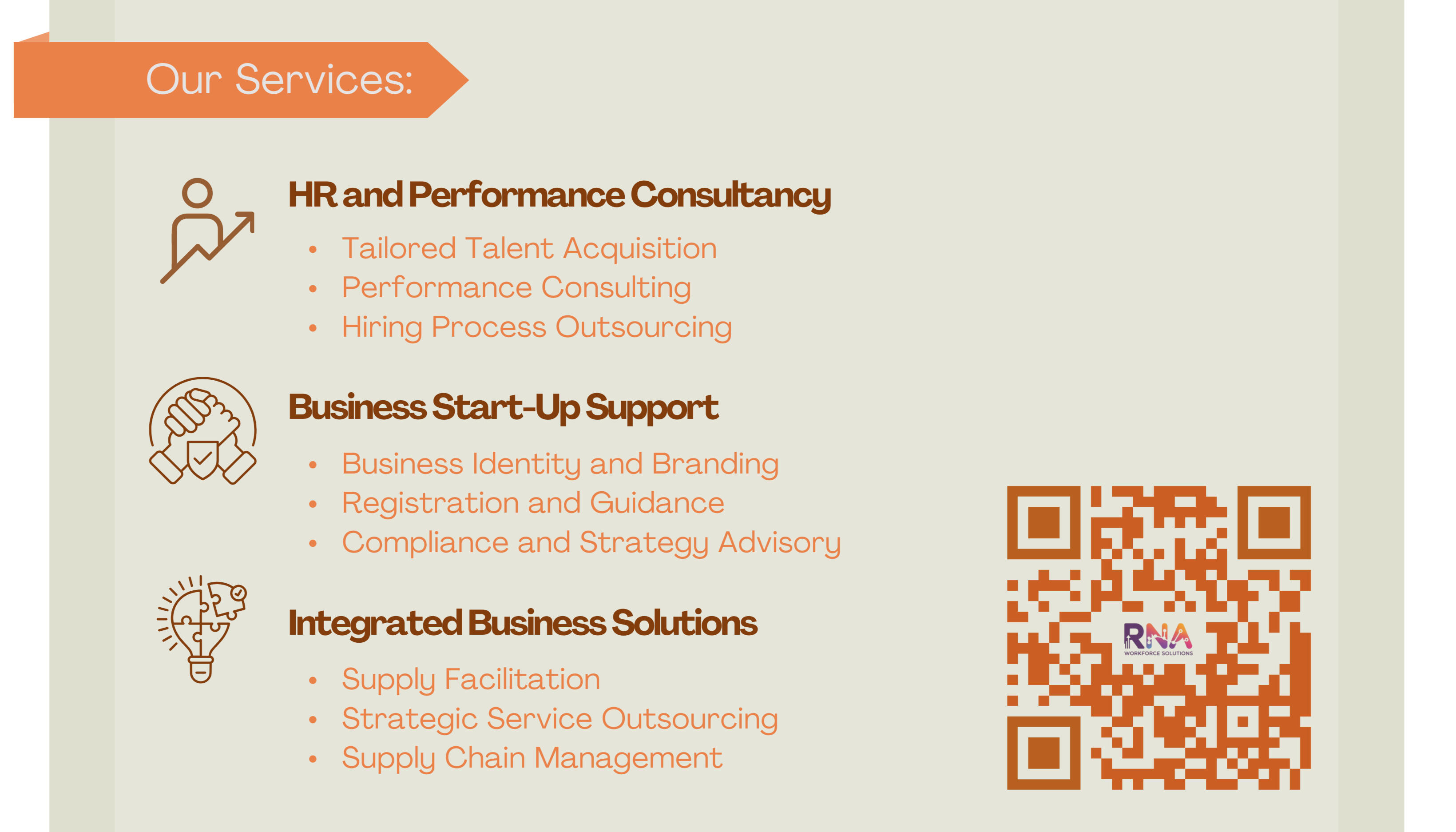Our specialties include tailored talent acquisition, performance consulting, hiring process outsourcing (HPO), business start-up support and strategic outsourcing solutions. RNA’s leadership ensures every solution is practical, people-first, and impact-driven